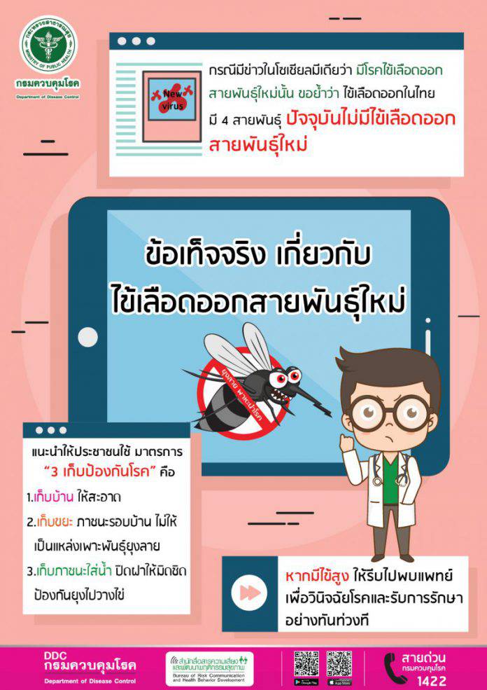 กรมควบคุมโรค กระทรวงสาธารณสุข ยืนยันว่าในปัจจุบันประเทศไทยไม่มีไข้เลือดออกสายพันธุ์ใหม่ มีเพียง 4 สายพันธุ์ที่เคยพบมาแล้ว แต่ละสายพันธุ์มีความรุนแรงไม่แตกต่างกันมาก ในช่วงนี้มีฝนตกอย่างต่อเนื่อง ทำให้มีน้ำขังตามภาชนะต่างๆ อาจเป็นแหล่งเพาะพันธุ์ของยุงลายได้ ขอให้ประชาชน ชุมชน ร่วมกันใช้มาตรการ “3 เก็บ ป้องกัน 3 โรค”