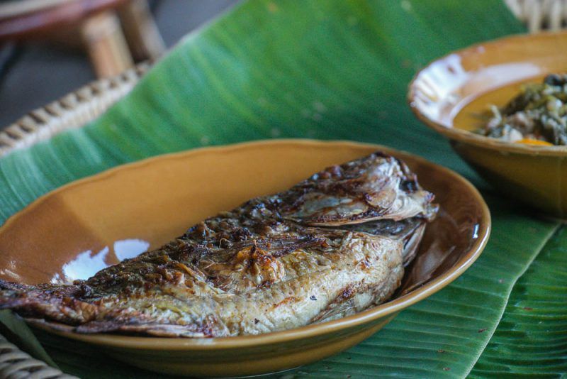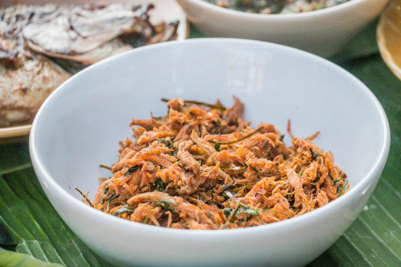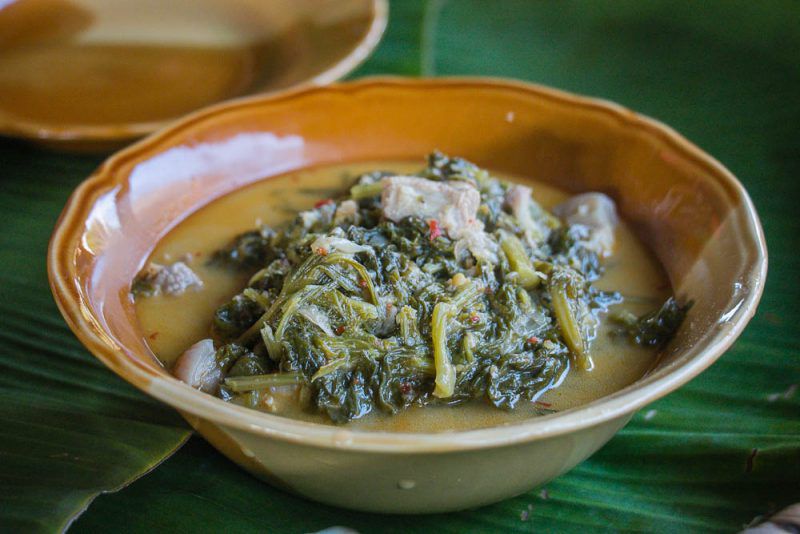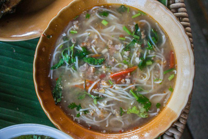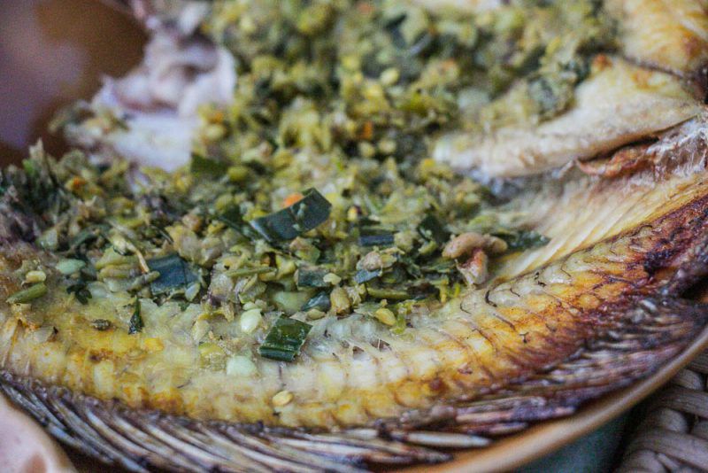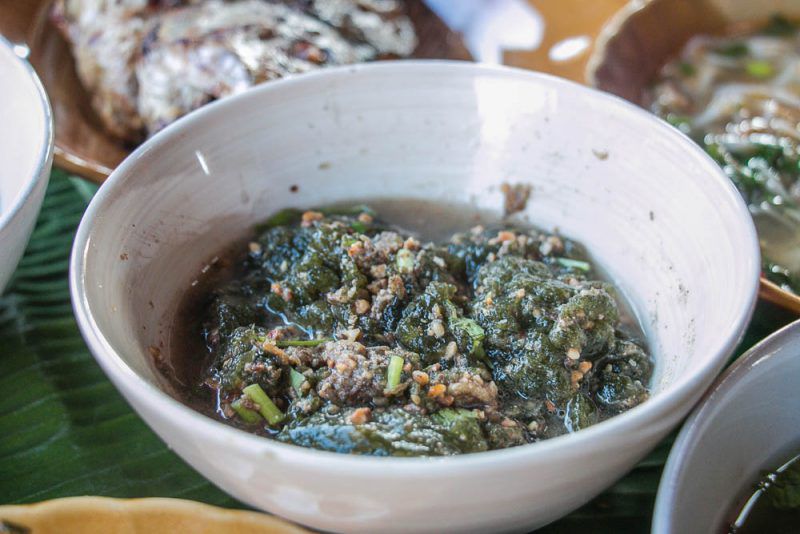 และเย็นนี้ เราก็ได้ร่วมล้อมขันโตกในมื้อเย็นกับแม่แสงดา ที่มีเรื่องเล่าสนุกสนานไม่จบสิ้น แม้กระทั่งอาหารแต่ละเมนู อย่าง จอผักกาดลื้อ แกงผักกาดส้ม แกงขนมจีนเส้นแห้ง จินซั่มพริก ปลาปิ้งอบ แต่ละชื่อไม่คุ้นหู แต่ก็ยังคุ้นตา ไม่รวมเจ้า “แอ่งแถะ” ลักษณะคล้ายวุ้นที่นำมายำ ทำมาจากใบเครือหมาน้อยมาคั้นจนเป็นวุ้น รสชาติแปลกประหลาด แต่พอได้ฟังแม่แสงดาคุยไปชิมไป ก็เพลินไปกับมื้อเย็นอันมีความสุขนี้ จนไม่อยากให้ถึงเวลาหกโมงเย็นเลย