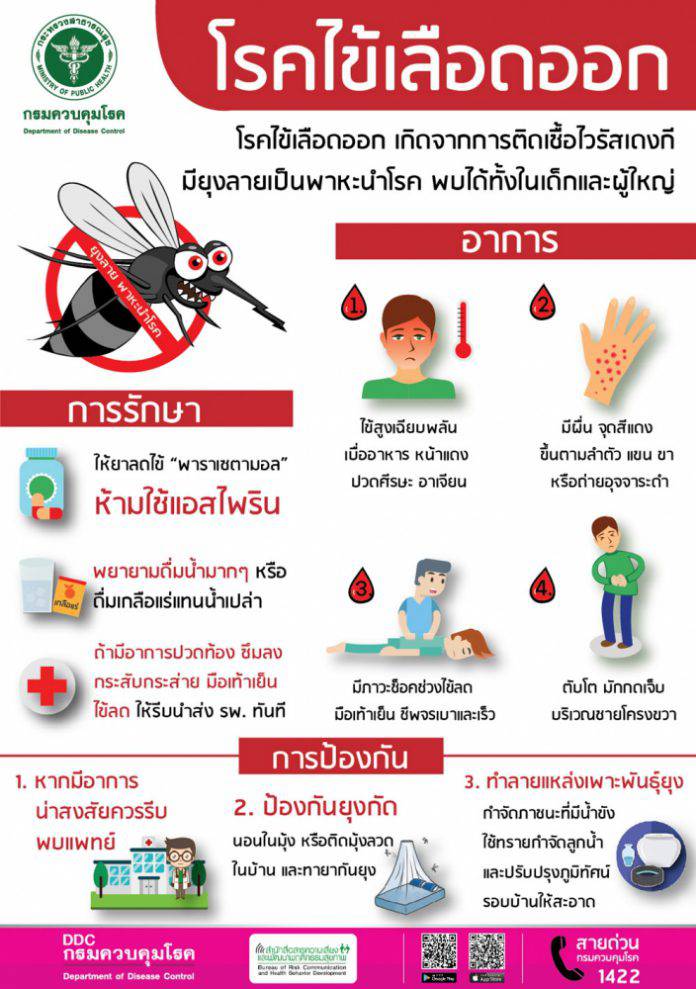 ส่วนในประชาชนขอให้ยึดหลัก 3 เก็บ ป้องกัน 3 โรค ได้แก่ 1.เก็บบ้านให้สะอาด ไม่รกทึบจนเป็นที่เกาะพักของยุงลาย 2.เก็บขยะ เศษภาชนะที่อาจมีน้ำขังไม่ให้กลายเป็นแหล่งเพาะพันธุ์ยุงลาย และ 3.เก็บภาชนะใส่น้ำปิดฝาให้มิดชิด ป้องกันไม่ให้ยุงลายลงไปวางไข่ เพื่อป้องกัน 3 โรค ได้แก่ โรคไข้เลือดออก โรคติดเชื้อไวรัสซิกา และโรคไข้ปวดข้อยุงลาย ทั้งนี้ หากมีอาการไข้สูงเฉียบพลันและไข้นานเกินกว่า 2 วัน อ่อนเพลีย ปวดเมื่อย อาจมีผื่นขึ้นใต้ผิวหนังตามแขน ขา ข้อพับ ควรรีบไปพบแพทย์ที่โรงพยาบาลโดยเร็ว เพื่อรับการวินิจฉัย หากมีข้อสงสัยสอบถามเพิ่มเติมได้ที่สายด่วนกรมควบคุมโรค โทร.1422
