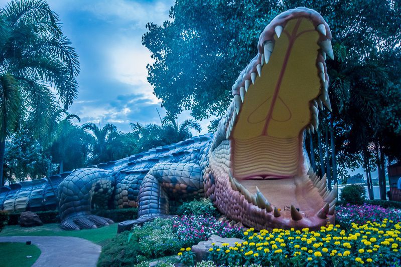 รูปปั้นพญาชาละวัน รูปปั้นจระเข้ยักษ์ที่มีความยาว 38 เมตร ยังเป็นสัญลักษณ์ในการต้อนรับผู้ที่เข้ามาเยือนบึงสีไฟ พร้อมเวิ้งน้ำกว้างใหญ่ ซึ่งวันนี้ เราต่างหวังว่า จะได้เห็นภาพของแสงสุดท้ายของวันในจุดนี้ แต่หมู่เมฆที่ปกคลุมในช่วงหน้าฝน ก็บดบังความหวังของเราไป เหลือไว้แค่ผืนฟ้าสีครามกับผืนน้ำที่นิ่งกริบ แวววาวคล้ายกระจกผืนใหญ่