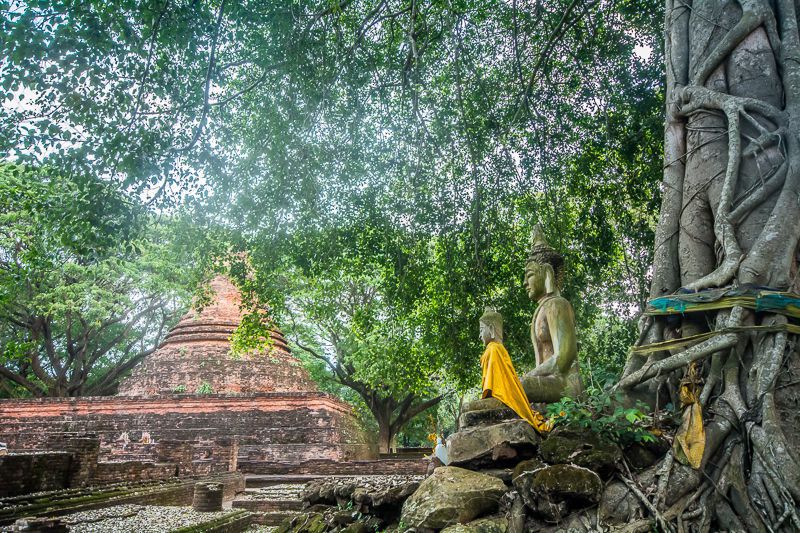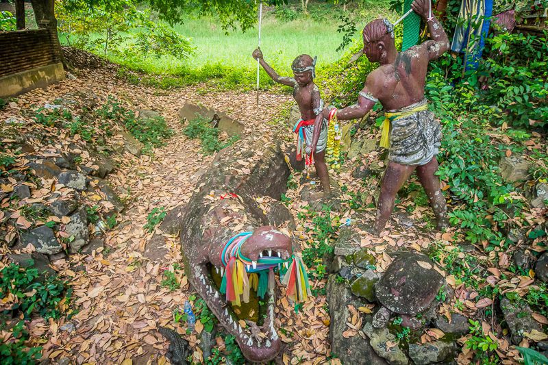 เราเดินออกมาด้านหน้า มีทางบอกไป “ถ้ำชาละวัน” ซึ่งมีที่มาจากวรรณคดีเรื่องไกรทอง เป็นถ้ำเล็กๆ ที่ทรุดโทรมไปตามกาล ปัจจุบันดินในบริเวณนี้พังทลายจนตื้นเขิน เห็นเพียงรูปปั้นไกรทองและชาละวันที่ทางจังหวัดได้สร้างไว้ตรงปากถ้ำ