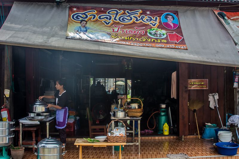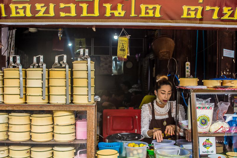 วันนี้เราเข้ามาเดินเล่นในย่านวังกรด และตั้งใจว่าจะมาฝากท้องกันที่นี่ด้วย นอกจากจะเดินชิมของอร่อยๆ จนแทบจะเต็มท้องแล้ว ก็ยังต้องการเติมเต็มความทรงจำนี้ด้วยการลิ้มลอง “ก๋วยเตี๋ยวปิ่นโต ต่ายฮะ” ซึ่งอยู่บริเวณตึกแถวหลังสถานีรถไฟ ร้านนี้คึกคักไปด้วยผู้คน ด้วยเอกลักษณ์ของภาชนะอย่างปิ่นโตขนาดกำลังดี