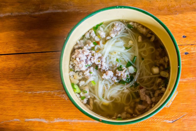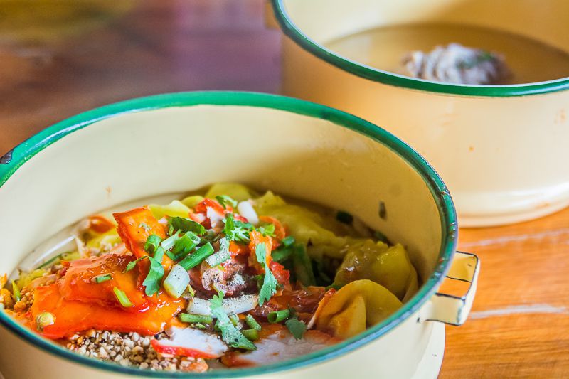 ถึงเวลาก๋วยเตี๋ยวลำเลียงมาในปิ่นโตเถาน้อย บะหมี่เกี๊ยวแห้งหมูแดง ปริมาณไม่มากนัก คนกินจุคงสักสองสามชามถึงจะอิ่ม แต่ราคาก็เบาตามลงไป 25-30 บาทเท่านั้น แถมยังเคียงมากับน้ำซุปต้มเล้ง แบบเต็มใจจัดให้ ลองแล้วได้รับความรู้สึกของก๋วยเตี๋ยวแบบบ้านๆ หอมวัตถุดิบทั้งถั่วคั่วและกุ้งแห้งฝอย และน้ำราดหมูแดงที่เข้มหอมกำลังดี เพื่อนๆ ที่มาด้วยกัน มักจะสั่งเป็นก๋วยเตี๋ยวต้มยำพริกสด เพราะเป็นสูตรของทางร้านที่ทำมานาน แอบลองชิมก็คิดว่ารสชาติใช้ได้ ไม่จัดจ้านนัก แต่ก็เพลินพุงกันทุกคน