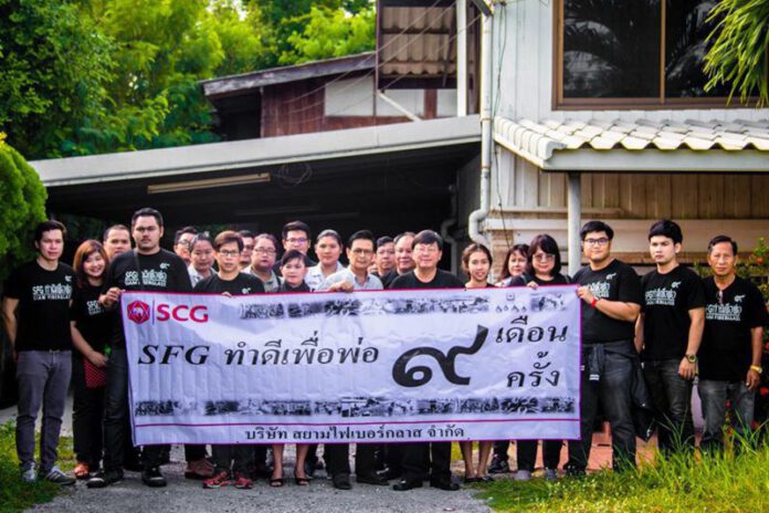นายสันชัย ห้างชัยเจริญ กรรมการผู้จัดการ (กลาง) บริษัท สยามไฟเบอร์กลาส จำกัด ในกลุ่มธุรกิจเอสซีจี ซิเมนต์-ผลิตภัณฑ์ก่อสร้าง (SCG Cement-Building Materials) ผู้ผลิต ผลิตภัณฑ์ฉนวนประเภทใยแก้ว ทั้งฉนวนกันความร้อนเอสซีจี วัสดุอะคูสติกเอสซีจี และแผ่นโปร่งแสงเอสซีจี นำทีมผู้บริหาร พนักงาน ออกเยี่ยมผู้ป่วยที่ไม่สามารถเดินทางเข้ารับการรักษาที่โรงพยาบาลตามวาระได้ ร่วมกับคณะเจ้าหน้าที่ โรงพยาบาลส่งเสริมสุขภาพตำบลหนองปลาหมอ อ.หนองแค จ.สระบุรี (ผู้ป่วยติดเตียง) พร้อมมอบสิ่งของเครื่องใช้ที่จำเป็นสำหรับผู้ป่วย เพื่อช่วยลดภาระค่าใช้จ่ายในการดูแลให้กับผู้ดูแล และครอบครัวผู้ป่วย ในเขตตำบลหนองปลาหมอ จ. สระบุรีอีก 1 กิจกรรมในโครงการ SFG ทำดีเพื่อพ่อ 9 โครงการ 9 เดือน ครั้งที่ 6 เพื่อน้อมรำลึกถึงพระมหากรุณาเป็นล้นพ้นของพระเจ้าอยู่หัวรัชกาลที่ ๙ ที่มีต่อปวงชนชาวไทย