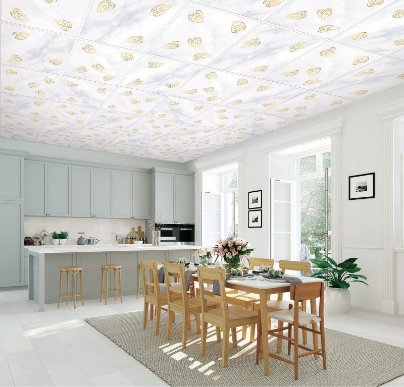 สำหรับฝ้าเพดาน ถือเป็นอีกจุดสำคัญที่สามารถทำให้บ้านดูโปร่งสบายตา ไม่ว่าเราจะเลือกใช้ฝ้าเรียบสีพื้น หรือจะเลือกฝ้าที่มีลวดลายตามที่เราต้องการ โดยเฉพาะลายที่จะช่วยเสริมวาสนาให้กับบ้าน เพื่อรับทรัพย์รับโชคลาภในปีใหม่ที่กำลังจะมาถึง กับแผ่นฝ้าทีบาร์ เปเปอร์ทัช ตราช้าง ลายใหม่ “เรืองทรัพย์” มาพร้อมกับความเป็นมงคลด้วยใบของต้นกวักเงินกวักทองลักษณะคล้ายใบรูปหัวใจ โดยออกแบบให้เข้ากับพื้นหลังลายหินอ่อนสีขาว ผสมผสานความงามที่กลมกลืนกับธรรมชาติอย่างลงตัว เสริมความเป็นสิริมงคลให้ที่อยู่อาศัยเกิดโชคลาภ กิจการรุ่งเรือง และร่ำรวย ทั้งนี้แผ่นทีบาร์ เปเปอร์ทัช ตราช้างมาพร้อมคุณสมบัติไม่แอ่นตัว คงทน และยังได้ฝ้าสวยสดใส มาตรฐานมอก 219-2552 แถมยังช่วยสร้างบรรยากาศภายในบ้านให้ร่มเย็นอีกด้วย
