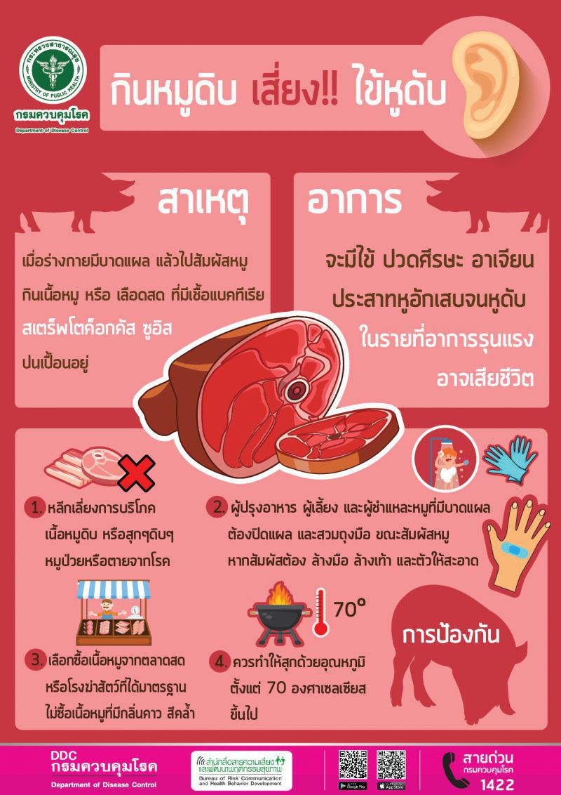 กินหมูสุกๆ ดิบๆ เสี่ยงโรคไข้หูดับ หูหนวกและเสียชีวิตได้