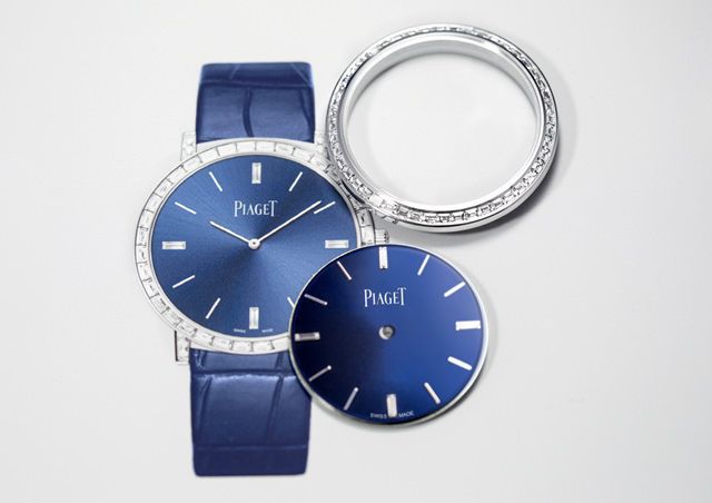 เริ่มด้วย เพียเจต์ อัลติพลาโน ตัวเรือนไวท์โกลด์ ขนาด 36 มิลลิเมตร ที่ออกแบบมาเพื่อเอาใจสุภาพสตรีผู้หลงใหลความคลาสสิค ขอบตัวเรือนประดับเพชรทรงบาแก็ตต์ มาพร้อมพื้นหน้าปัดโทนสีน้ำเงิน ไล่เฉดที่ชวนให้ระลึกถึงตัวตนของแบรนด์ตลอดช่วงทศวรรษที่ผ่านมา ตกแต่งอย่างประณีตด้วยลวดลายรัศมีดวงอาทิตย์ ขับเคลื่อนด้วยกลไกไขลานด้วยมือแบบบางพิเศษ 430P จับคู่เข้ากันกับสายหนังจระเข้สีน้ำเงิน ผลิตจำกัดเพียง 88 เรือน