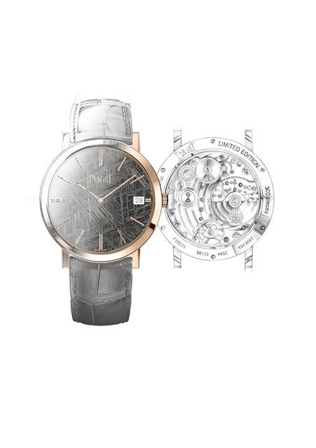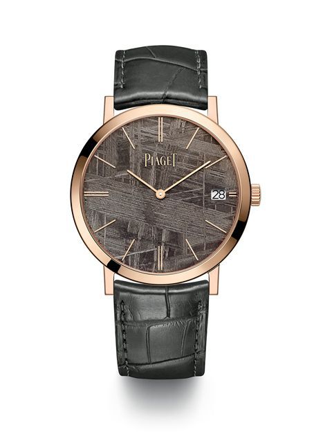 ปิดท้ายที่ เพียเจต์ อัลติพลาโน บนตัวเรือนพิ้งค์โกลด์ ขนาด 40 มิลลิเมตร เรือนเวลาที่เหล่าบุรุษต่างจับจ้องในความสง่างามที่ยากจะเลียนแบบของแพทเทิน Widmanstätten บนพื้นหน้าปัดหินอุกกาบาตสีเทา เคียงคู่เข็มบอกชั่วโมงและนาทีดีไซน์เรียบง่ายสีเดียวกับตัวเรือน และหน้าต่างบอกวันที่ที่ตำแหน่ง 3 นาฬิกา ขับเคลื่อนด้วยกลไกไขลานอัตโนมัติแบบบางพิเศษ 1203P เข้าคู่สายรัดข้อมือหนังจระเข้สีเทา ผลิตจำกัด 300 เรือน