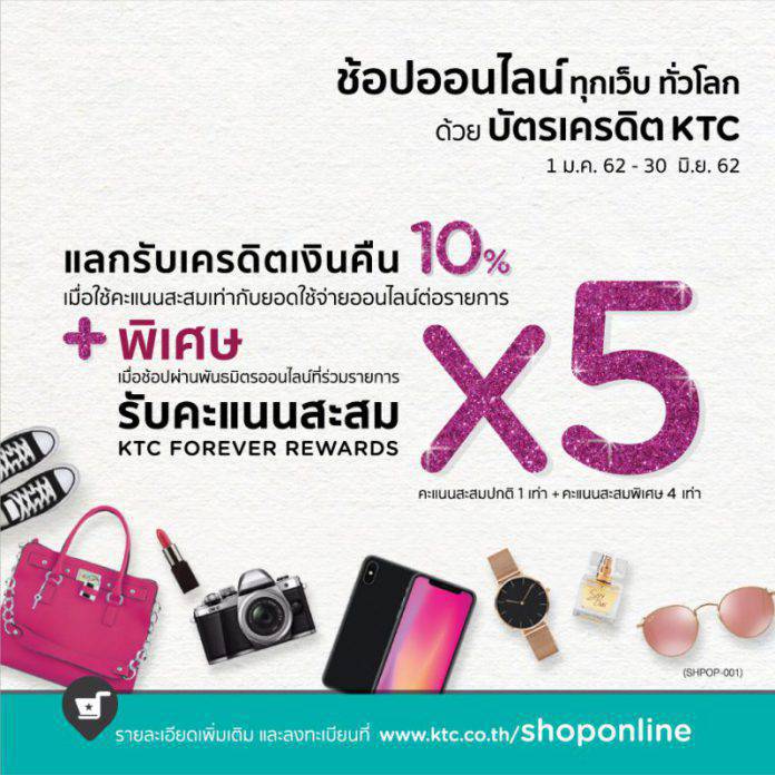 นายณัฐสิทธิ์ สุนทราณู ผู้อำนวยการ – ธุรกิจบัตรเครดิต “เคทีซี” หรือ บริษัท บัตรกรุงไทย จำกัด (มหาชน) กล่าวว่า “ยอดการใช้จ่ายด้วยบัตรเครดิตเคทีซีผ่านช่องทางออนไลน์ในปี 2561 มีการเติบโตสูงอย่างต่อเนื่อง โดยเฉพาะใน 5 หมวดสินค้า ได้แก่ หมวดเครื่องใช้ไฟฟ้า / เครื่องสำอาง / เสื้อผ้าแฟชั่น / สินค้าตกแต่งภายในบ้าน / สินค้าแม่และเด็ก และสำหรับช่วงครึ่งแรกของปี 2562 นี้ เพื่อต้อนรับช่วงเทศกาลตรุษจีน วันแห่งความรัก และอีกหลายเทศกาลแห่งความสุขที่กำลังจะเกิดขึ้น เคทีซีจึงคัดสรร 2 สิทธิพิเศษหลัก เพื่อมอบให้กับสมาชิกที่ชื่นชอบการซื้อสินค้าผ่านช่องทางออนไลน์ ได้แก่ ต่อที่ 1 แลกรับเครดิตเงินคืน 10% เมื่อใช้คะแนน KTC FOREVER เท่ากับยอดใช้จ่ายออนไลน์ต่อรายการ ต่อที่ 2 รับคะแนน KTC FOREVER 5 เท่า (คะแนนปกติ 1 เท่า และคะแนนพิเศษ 4 เท่า) พร้อมรับส่วนลดหรือสิทธิพิเศษเพิ่มเติมจากเว็บไซต์ชั้นนำที่เข้าร่วมรายการอีกมากมาย ตั้งแต่วันที่ 1 มกราคม 2562 – 30 มิถุนายน 2562 โดยสามารถลงทะเบียนแลกรับเครดิตเงินคืนและคะแนนสะสม X5 ได้ที่ www.ktc.co.th/shoponline”