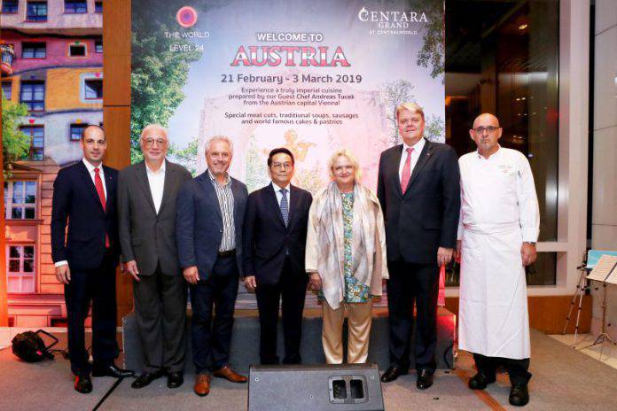 ดร.อีวา แฮเกอร์ (ที่ 3 จากขวา) เอกอัครราชทูตแห่งสาธารณรัฐออสเตรียประจำประเทศไทย พร้อมด้วย มร.โรเบิร์ต เมาเรอร์ เลิฟเลอร์ (ที่ 2 จากขวา) ผู้จัดการทั่วไปของโรงแรมเซ็นทาราแกรนด์ฯ เซ็นทรัลเวิลด์ และผู้อำนวยการกลุ่มงานปฏิบัติการ – กลุ่มโรงแรมในกรุงเทพฯ ร่วมเป็นประธานเปิดงานเทศกาลอาหารออสเตรีย “Austria Food Festival” ณ ห้องอาหารเดอะเวิลด์ ชั้น 24 ของโรงแรมฯ โดยมี อดิศักดิ์ ภาณุพงศ์ (กลาง) อดีตเอกอัครราชทูตไทยประจำประเทศออสเตรีย, คอร์เค เอดูอาร์โต เชน ชาร์เปนเตียร์ (ที่ 2 จากซ้าย) อดีตเอกอัครราชทูตสหรัฐเม็กซิโกประจำประเทศไทย, แกร์ฮาร์ท เกิทซ์ (ที่ 3 จากซ้าย), มร.เบิร์นด รูดิเกียร์ (ซ้ายสุด) ผู้ช่วยผู้จัดการทั่วไป ฝ่ายอาหารและเครื่องดื่ม และได้รับเกียรติจากเชฟรับเชิญชาวออสเตรีย เชฟแอนเดรียส ทัค (ขวาสุด) ร่วมเปิดงานในครั้งนี้ ณ ห้องอาหารเดอะเวิลด์ โรงแรมเซ็นทาราแกรนด์ฯ เซ็นทรัลเวิลด์ เมื่อเร็วๆนี้