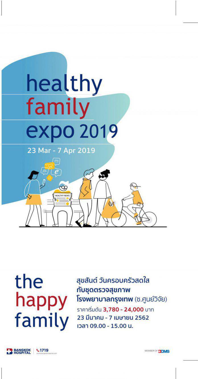โรงพยาบาลกรุงเทพ ขอเชิญท่านและคนที่ท่านรักเข้ารับการตรวจสุขภาพ ในงานสุขสันต์วันครอบครัวสดใส กับ Healthy Family Expo 2019 ด้วย “ชุดตรวจสุขภาพ the happy family” ประกอบด้วย ชุดตรวจสุขภาพหลักชุดตรวจสุขภาพผู้สูงวัย ในราคา 3,780 – 24,000 บาท นอกจากนี้ ยังมีชุดตรวจสุขภาพหัวใจ ชุดตรวจสุขภาพสมอง ชุดตรวจมะเร็ง ชุดตรวจตาและเลสิก ชุดตรวจสุขภาพสตรี รายการเสริมความงาม และการตรวจสุขภาพฟัน เช่น ชุดตรวจหาความเสี่ยงฟันผุ การฟอกสีฟัน การตรวจสอบกลิ่นปากด้วยเครื่องพร้อมปรึกษาทันตแพทย์ เป็นต้น ร่วมเป็นส่วนหนึ่งในวันสุขสันต์กับครอบครัวที่สดใส ได้ที่รพ. กรุงเทพ (ซ.ศูนย์วิจัย) ตั้งแต่วันที่ 23 มีนาคม – 7 เมษายน 2562 เพื่ออำนวยความสะดวกและเพิ่มความรวดเร็ว สามารถซื้อชุดตรวจสุขภาพแบบออนไลน์ได้แล้วที่ www.bangkokhospitalshop.com หรือสอบถามรายละเอียดข้อมูลเพิ่มเติม โทร. 1719