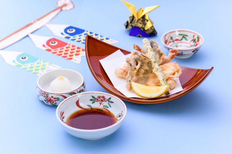 นอกจากการประดับธงรูปปลาคาร์ฟแล้ว ห้องอาหารยามาซาโตะยังประดับบริเวณหน้าห้องอาหารด้วยตุ๊กตาสวมชุดเกราะและหมวกซามูไรเพื่ออวยพรให้เด็กๆ เติบโตด้วยความเข้มแข็งสง่างามเยี่ยงบรรดานักรบ ในโอกาสนี้ เชฟชิเงรุ ฮางิวาระ (Shigeru Hagiwara) หัวหน้าพ่อครัวประจำห้องอาหารยามาซาโตะ ยังได้จัดเตรียมอาหารชุดพิเศษเพื่อให้บริการในช่วงเทศกาลวันเด็กผู้ชาย โดยอาหารชุดมื้อกลางวัน ราคาชุดละ 1,500++ บาท ประกอบด้วยอาหารน่ารับประทาน อาทิ ปลาแซลมอนรมควัน กุ้ง เห็ดไมทาเกะราดด้วยซอสไข่แดง ซุปใสใส่ลูกชิ้นหอยเชลล์ เห็ดและผิวยูซุ ปลาดิบชั้นดี 3 ชนิด (ปลาทูน่า ปลาหางเหลือง และ หอยปีกนก) ปลามูนฟิชย่างไฟอ่อนๆ ราดซอสมิโซะสูตรพิเศษ เทมปุระกุ้ง ปลาไหล และเห็ดชิทาเกะ ข้าวตุ๋นปลากระพง โรยไข่ปลาแซลมอนเสิร์ฟกับซุปมิโซะ ปิดท้ายด้วยผลไม้สดตามฤดูกาลเสิร์ฟพร้อมขนมหวานประจำเทศกาลวันเด็กผู้ชาย คาชิวะโมจิ ที่ทำจากแป้งข้าวเหนียวสอดไส้ถั่วแดงห่อด้วยใบคาชิวะ หรือใบโอ๊ค ที่ชาวญี่ปุ่นเชื่อว่าเป็นใบไม้ที่แข็งแรง จึงเป็นที่นิยมรับประทานในเทศกาลวันเด็กผู้ชาย เพื่ออวยพรให้เด็กผู้ชายมีความอดทน แข็งแกร่ง และมีชีวิตยืนยาวเสมือนใบคาชิวะ