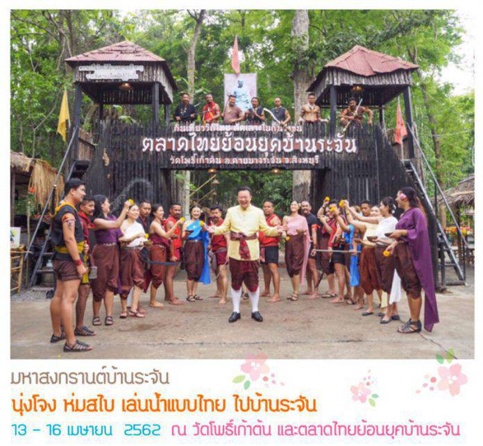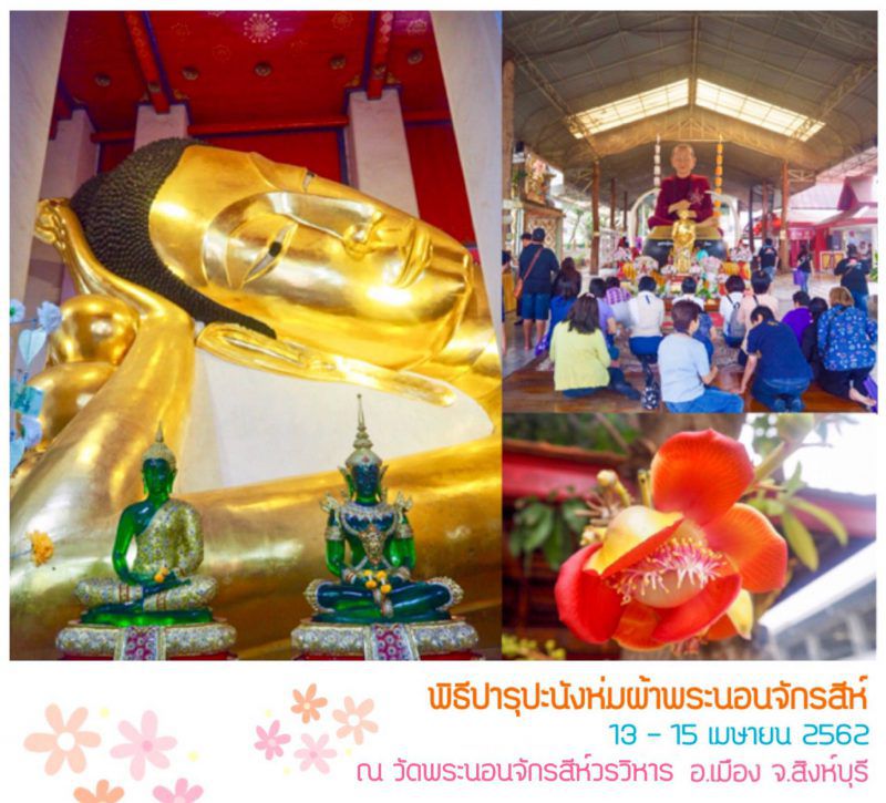 -มหาสงกรานต์บ้านระจัน “นุ่งโจง ห่มสไบ เล่นน้ำแบบไทย ไปบ้านระจัน” วันที่ 13 – 16 เมษายน 2562 ณ วัดโพธิ์เก้าต้น และตลาดไทยย้อนยุคบ้านระจัน อ.ค่ายบางระจัน จ.สิงห์บุรี-พิธีปารุปะนังห่มผ้าพระนอนจักรสีห์ วันที่ 13 – 15 เมษายน 2562 ณ วัดพระนอนจักร์สีห์วรวิหาร อ.เมือง จ.สิงห์บุรี