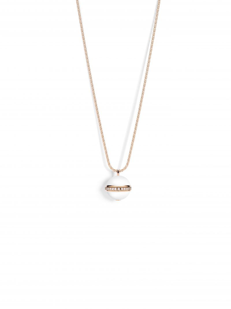 White chalcedony rose gold pendant (G33PD400) สร้อยคอโรสโกลด์ 18 กะรัต พร้อมจี้ประดับคาลซิโดนี สีขาวเลอค่า 2 ชิ้น น้ำหนักรวมกว่า 15 กะรัต คั่นกลางด้วยวงแหวนหมุนได้ประดับเพชรบริลเลียนต์คัต 28 เม็ด ปรับระดับความยาวของสายได้ตามสไตล์ที่ชื่นชอบ สูงสุด 85 เซนติเมตร หรือจะใส่แบบสั้นเป็นสองเส้นซ้อนกันก็เข้ากับหลากลุคอย่างง่ายดาย
