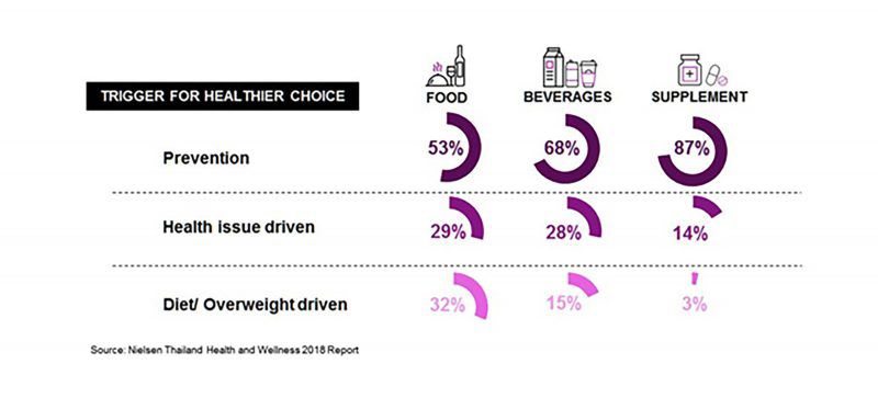 ไลฟ์สไตล์เพื่อสุขภาพกำลังได้รับความนิยมเป็นอย่างมากในประเทศไทยเนื่องจากผู้บริโภคเริ่มตระหนักถึงความสำคัญของสุขภาพและความเป็นอยู่ที่ดีขึ้น โดยผู้บริโภคชาวไทยส่วนใหญ่กล่าวว่าพวกเขาเข้าร่วมอย่างน้อยหนึ่งในห้ากิจกรรมเพื่อส่งเสริมสุขภาพและความเป็นอยู่ที่ดี ไม่ว่าจะเป็นการรับประทานอาหารหรือเครื่องดื่มเพื่อสุขภาพ การรับประทานอาหารเสริม ออกกำลังกาย และใช้แอปหรือแกดเจ็ตต่างๆ เพื่อวัดและสังเกตุการณ์การออกกำลังกาย ในขณะที่ผู้บริโภคมากกว่า 90% กล่าวว่าพวกเขาบริโภคเครื่องดื่มเพื่อสุขภาพอย่างสม่ำเสมอและมากกว่า 80% บริโภคอาหาร/ขนมขบเคี้ยวเพื่อสุขภาพเป็นประจำ เราจะเห็นได้ว่าการบริโภควิตามิน /แร่ธาตุ/อาหารเสริมอื่นๆ รวมถึงการออกกำลังกาย/เล่นกีฬา และการใช้อุปกรณ์ในการวัดการออกกำลังกายนั้นมีอัตราการเข้าร่วมที่ต่ำกว่าการบริโภคอาหารและเครื่องดื่มเพื่อสุขภาพอยู่มาก.