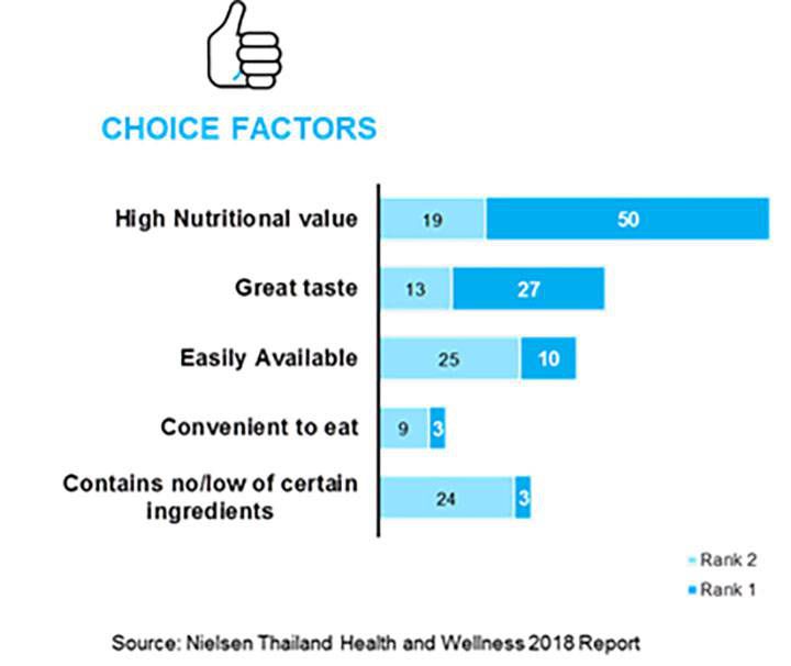 เพื่อถามผู้บริโภคชาวไทยถึงสิ่งที่คิดเป็นอย่างแรกเมื่อพูดถึงอาหารและของว่างเพื่อสุขภาพ คนส่วนใหญ่เลือกผัก/สลัด/อาหารคลีน (34%) และธัญพืช/ถั่ว/อาหารที่ใช้ข้าวสาลี (28%) ซึ่งปัจจัยที่มีผลต่อการเลือกอาหารและขนมขบเคี้ยวเพื่อสุขภาพนั้นอยู่ที่คุณค่าทางโภชนาการที่สูง นอกจากนั้นก็จะมีเรื่องของรสชาติที่ดีและหาซื้อง่าย (ดูตารางที่ 2) สำหรับเครื่องดื่มเพื่อสุขภาพ คนไทยส่วนมากจะนึกถึง Functional drink และน้ำผัก/ผลไม้ /สมุนไพร เป็นหลัก