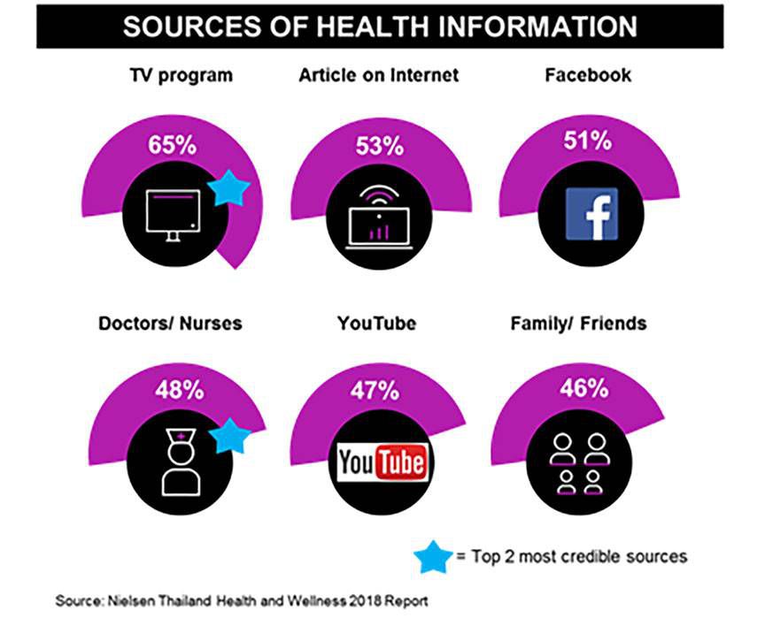 รายการทีวีและข้อมูลจากผู้เชี่ยวชาญ เช่น แพทย์/พยาบาลเป็นแหล่งข้อมูลที่น่าเชื่อถือสูงสุด 2 อันดับแรกเวลาที่ผู้บริโภคแสวงหาข้อมูลด้านสุขภาพ ในขณะที่คนไทยส่วนใหญ่ได้รับข้อมูลด้านสุขภาพจากรายการทีวี เราจะเห็นได้ว่าการการเล่าสู่กันฟัง และโซเชียลมีเดียก็มีบทบาทสำคัญเป็นอย่างมาก ซึ่งบทความบนอินเทอร์เน็ต Facebook และ YouTube ถือได้ว่าเป็นแหล่งข้อมูลยอดนิยมเช่นเดียวกัน (ดูตารางที่ 3) อย่างไรก็ตาม มีเพียง 1 ใน 4 ของผู้ผู้บริโภคเท่านั้นที่ใช้ข้อมูลบนบรรจุภัณฑ์เป็นแหล่งข้อมูล ซึ่งเราเห็นได้ถึงโอกาสสำหรับผู้ผลิตในการเพิ่มtouch-point และการกระตุ้นการรับรู้ของผู้บริโภคจากฉลากผลิตภัณฑ์และเว็บไซต์ที่เกี่ยวข้อง