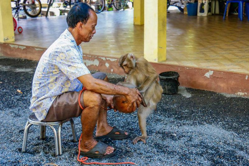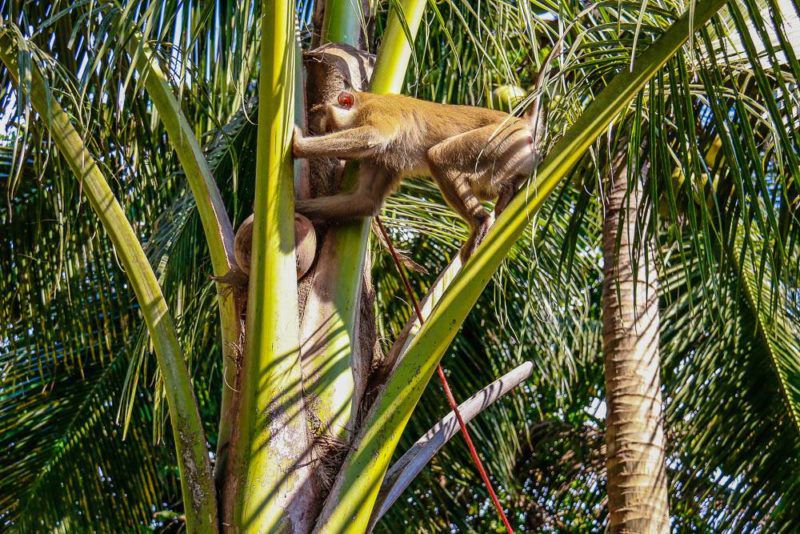 มะพร้าวกับชาวเลเป็นของคู่กัน และแม้ว่าลิงจะคู่กับกล้วย แต่ลิงก็ชอบขึ้นต้นมะพร้าวมากเช่นกัน เพราะที่นี่คือ “ศูนย์ฝึกลิงบ้านกระแจะแดะ” อ.กาญจนดิษฐ์