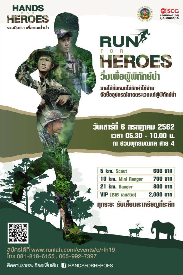 มูลนิธิเอสซีจี ขอเชิญชวนนักวิ่งและผู้ที่สนใจ ร่วมเป็นอีกหนึ่งมือเพื่อส่งกำลังใจไปยังผู้พิทักษ์ป่า ผ่านกิจกรรม “Run for Heroes” วิ่งเพื่อผู้พิทักษ์ป่า ภายใต้โครงการ HANDS FOR HEROES รวมมือเรา เพื่อคนเฝ้าป่า ปีที่ 2 ในวันเสาร์ที่ 6 กรกฎาคม 2562 เวลา 05.30 – 10.00 น. ณ สวนพุทธมณฑล จังหวัดนครปฐม การวิ่งแบ่งออกเป็น 3 ประเภท ได้แก่ 1. Scout 5 KM. ราคา 600 บาท 2. Mini Ranger 10 KM. ราคา 700 บาท 3. Ranger 21 KM. ราคา 800 บาท และหากท่านใดที่ต้องการสมทบทุนเพิ่มเติมยังมี VIP (BIB เลขสวย) ราคา 2,000 บาท ทั้งนี้การวิ่งทุกระยะจะได้รับเสื้อเเละเหรียญที่ระลึก รายได้ทั้งหมดจากการจัดกิจกรรมไม่หักค่าใช้จ่ายนำไปจัดซื้อชุดอุปกรณ์ลาดตระเวนที่จำเป็นมอบให้กับเจ้าหน้าที่พิทักษ์ป่าทั่วประเทศ เพื่อสร้างขวัญกำลังใจ ให้พวกเขาปฏิบัติหน้าที่ต่อไปอย่างไม่ต้อง ‘ห่วงหน้า พะวงหลัง’