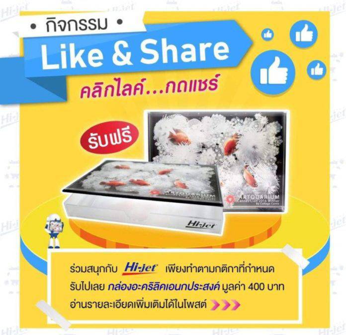 บริษัท ปภาวิน จำกัด ผู้จัดจำหน่ายกระดาษและหมึกพิมพ์ ภายใต้แบรนด์ Hi-jet (ไฮ-เจ็ท) เชิญชวนร่วมสนุกกับกิจกรรม Like & Share คลิกไลค์…กดแชร์ รับฟรีกล่องอะคริลิคเอนกประสงค์ เหมาะสำหรับใส่ของเบ็ดเตล็ด วัสดุอย่างดี ทนทาน มูลค่าถึง 400 บาท ฟรี! เพียงแต่เข้าไปใน Facebook Fan page : Hi-jet และเลือกทำตามกติกาได้ 2 วิธี ได้แก่ 1. กด Like & Share กิจกรรมและเขียนแคปชั่นสั้น ๆ พร้อมติดแฮชแท็ก # HijetPaper #กระดาษคุณภาพไฮเจ็ท จากนั้นให้โพสต์ลงกลุ่ม 10 กลุ่ม แล้วแคปหลักฐานส่งมาใต้โพสต์ (ผู้ร่วมกิจกรรมต้องโพสต์หลักฐานใต้โพสต์กิจกรรมเท่านั้น)