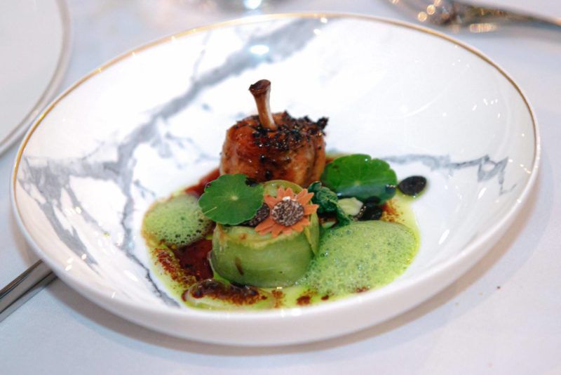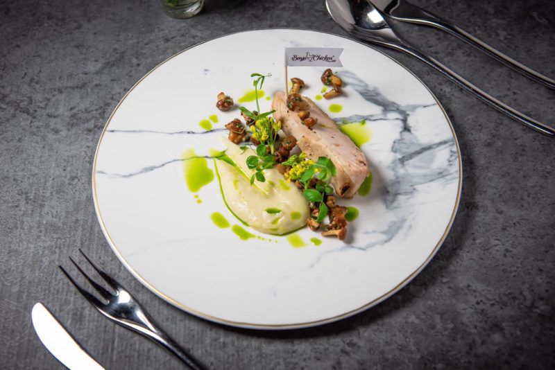 มาถึงเมนคอร์ส์ เมนูหลักที่เชฟทั้งสองร่วมสร้างสรรค์ออกมาได้น่าสนใจ คือ คอร์สไก่ “Benja Chicken breast, mash potatoes with Epoisses, morel and port (Savelberg)” เสิร์ฟคู่กับ “Benja Chicken wing, cabbages and Australian black winter truffle (J’AIME by Jean Michel Lorain) ที่แบ่งเป็น 2 ส่วน ส่วนแรก เชฟเฮงค์ ได้นำอกไก่ (เบญจา ชิกเก้น) มาอบสุญญากาศ (sous-vide) เพื่อคงความชุ่มฉ่ำเอาไว้ ก่อนนำไปผัดเนย เสิร์ฟพร้อมซอสเห็ด morel ป่า ส่วนเชฟอเมริโก้ นำเมนู Truffe au choux ที่ขึ้นชื่อของเชฟฌอง-มิเชล มาตีความใหม่ พาสต้าถูกรังสรรค์ด้วยเทคนิคแบบฝรั่งเศส ผสมเห็ด black winter truffle จากออสเตรเลีย ผสานอิทธิพลเอเชียด้วยบ็อคซอย และใบบัวบก รวมทั้ง ปีกไก่ จากเบญจา ชิกเก้น