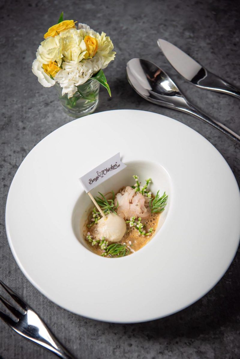 ต้อนรับแขกพิเศษ ด้วยเมนูคานาเป้ Banana and Foie Gras (by Savelberg) และ Banana and Blue Cheese by J’AIME (by Jean Michel Lorain) จากนั้นเริ่มคอร์สด้วย อาหารทานเล่นเมนูพิเศษ “Benja Chicken, White Asparagus and Crustacean Emulsion (J’AIME by Jean Michel Lorain) ที่ปรุงจากเนื้อไก่เบญจา ชิกเก้น คัดสรรส่วนอก นำมาจี่ไฟ เสิร์ฟคู่หน่อไม้ฝรั่งขาวผัดซอส หอม นุ่ม ฉ่ำ ลงตัว จากนั้น เรียกน้ำย่อยด้วยเมนู Lobster, Fennel Salad and Orange (Savelberg) และ Pan-seared Scallop and Beetroot Texture (Savelberg) ที่ใช้หอยเชลล์ส่งตรงจากเนเธอร์แลนด์ บ้านเกิดของเชฟ และรังสรรค์เป็นพิเศษเฉพาะงานนี้  ต่อด้วยจานปลา (Fish Course) ที่เป็นอาหารโปรดของเชฟเฮงค์ Grilled North Sea turbot, coconut sauce, mango salad and venere rice (Savelberg