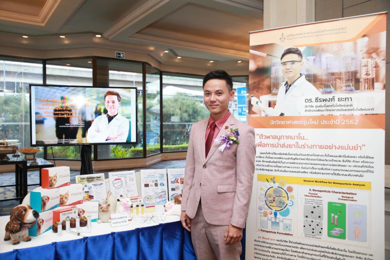 1. ดร.ธีรพงศ์ ยะทา นักวิจัย ศูนย์นาโนเทคโนโลยีแห่งชาติ สำนักงานพัฒนาวิทยาศาสตร์และเทคโนโลยีแห่งชาติ ผลงานวิจัย “ตัวพาอนุภาคนาโน เพื่อการนำส่งยาในร่างกายอย่างแม่นยำ”