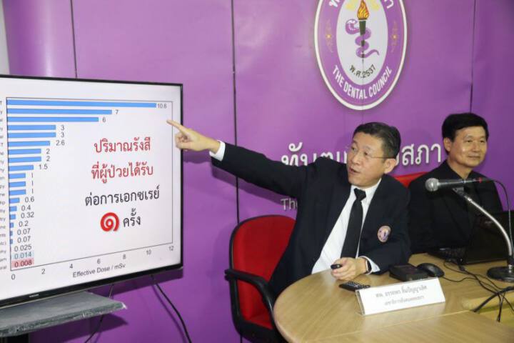 “จากผลการวัดปริมาณรังสีจากเครื่องเอกซเรย์ฟันที่ออกมา พบว่า การเอกซเรย์ในปาก ผู้ป่วยจะได้รับรังสี 0.001 mSv ขณะที่การเอกซเรย์นอกปาก ได้รับรังสี 0.024 mSv ซึ่งอยู่ในระดับที่ต่ำกว่าการเอกซเรย์อวัยวะร่างกายในส่วนอื่นๆ”รศ.ทพ.สุนทรา กล่าว