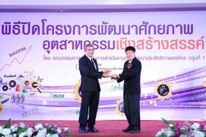 นายธนวัฒน์ เกิดประเสริฐ (ซ้าย) ที่ปรึกษาด้านเสียงและความร้อน บริษัท สยามไฟเบอร์กลาส จำกัด ในกลุ่มธุรกิจเอสซีจี ซิเมนต์-ผลิตภัณฑ์ก่อสร้าง (SCG Cement-Building Materials) ผู้ผลิต ผลิตภัณฑ์ฉนวนประเภทใยแก้ว ทั้งฉนวนกันความร้อนเอสซีจี วัสดุอะคูสติกเอสซีจี และแผ่นโปร่งแสงเอสซีจี เข้าโชว์ศักยภาพสุดยอดนักพัฒนานวัตกรรมเชิงสร้างสรรค์ด้านสิ่งแวดล้อม พร้อมเข้ารับโล่เกียรติยศผู้ประกอบการด้านอุตสาหกรรม ที่นำหลักความคิด การออกแบบเชิงสร้างสรรค์ สู่ไทยแลนด์ 4.0 ด้วยการนำวัสดุรีไชเคิลมาประยุกต์ใช้ในรูปแบบใหม่ ที่นอกจากให้ผลด้านสิ่งแวดล้อม ตั้งแต่ต้นน้ำยันปลายน้ำแล้ว ยังเป็นการสร้างประโยชน์ที่ให้ความสุขในครัวเรือนและสังคมอย่างยั่งยืน โดยมี นายทองชัย ชวลิตพิเชฐ (ขวามือ) ผู้ตรวจราชการกระทรวงอุตสาหกรรม เป็นผู้มอบ ในงานพิธีปิดโครงการพัฒนาศักยภาพอุตสาหกรรมเชิงสร้างสรรค์ ณ ห้องแซฟไฟร์ 204-205 ศูนย์แสดงสินค้าและการประชุมอิมแพค เมืองทองธานี