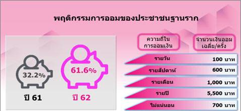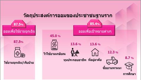 สำหรับวัตถุประสงค์ การออมของประชาชนฐานราก ส่วนใหญ่มีการออมเพื่อใช้ยามฉุกเฉิน/เจ็บป่วย (ร้อยละ 87.5) และออมเพื่อเป้าหมายต่างๆ ซึ่งพบว่า 3 อันดับแรก คือ ออมเพื่อเก็บไว้ใช้ยามเกษียณ (ร้อยละ 45.0) เป็นทุนประกอบ อาชีพ และเพื่อที่อยู่อาศัย (ร้อยละ 13.6) ซึ่งมีสัดส่วนเท่ากัน และซื้อยานพาหนะ (ร้อยละ 12.3)