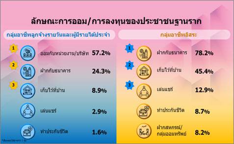 เมื่อสำรวจลักษณะการออมและการลงทุนที่มีในปัจจุบันของประชาชนฐานราก พบว่า กลุ่มตัวอย่างที่เป็นลูกจ้างประจำจะมีการออมกับหน่วยงาน/บริษัท อาทิ จ่ายเงินสมทบ เข้ากองทุนสำรองเลี้ยงชีพ/ประกันสังคมฯ และฝากกับธนาคาร ในขณะที่กลุ่มที่มีอาชีพอิสระจะฝากกับธนาคาร เก็บไว้ที่บ้าน และเล่นแชร์