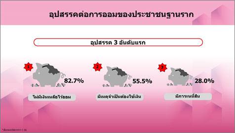 อุปสรรคสำคัญที่ประชาชนฐานราก ไม่สามารถออมเงินได้ คือ ไม่มีเงินเหลือไว้ออม (ร้อยละ 82.7) มีเหตุจำเป็นต้องใช้เงิน (ร้อยละ 55.5) และมีภาระหนี้สิน (ร้อยละ 28.0)