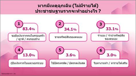 ถ้าหากมีเหตุฉุกเฉิน (ไม่มีรายได้) ประชาชนฐานรากจะทำอย่างไร ? พบว่า ส่วนใหญ่ร้อยละ 83.4 เลือกที่จะขอยืมเงินจากคนในครอบครัว/ญาติ/คนรอบข้าง รองลงมาคือขายทรัพย์สินของตนเอง (ร้อยละ 34.1) และจำนอง/จำนำทรัพย์สินของตนเอง (ร้อยละ 33.1)