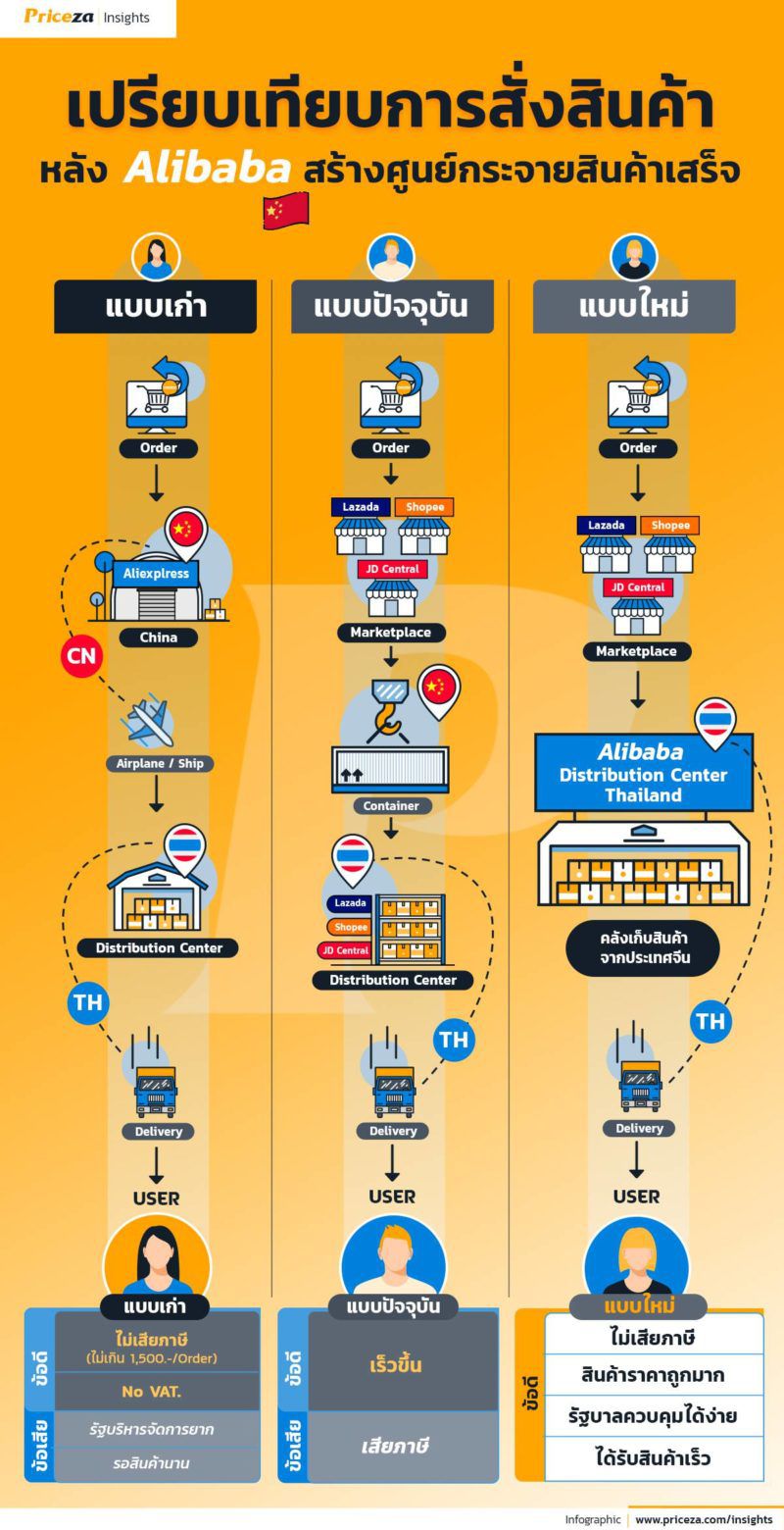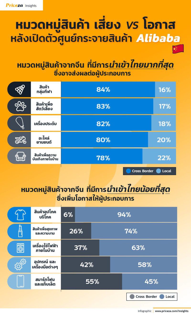 - การเพิ่มสินค้า Cross Border ให้ทะลักเข้ามาจำนวนมหาศาล อ้างอิงข้อมูลจาก Priceza แพลตฟอร์มเพื่อการค้นหาสินค้า และบริการเปรียบเทียบราคา ซึ่งได้ทำการเก็บข้อมูลของสินค้าจากต่างประเทศ (Cross Border) เปรียบเทียบกับ สินค้าภายในประเทศ (Local) ระหว่างวันที่ 1 มกราคม – 30 มิถุนายน 2562 พบว่า ในแพลตฟอร์ม Priceza มีสัดส่วนสินค้า Cross Border 58% ในขณะที่มีสินค้า Local 42% จากจำนวนสินค้าราวๆ 50 ล้านชิ้น โดยสินค้า Cross Border ส่วนใหญ่นั้นเป็นสินค้าจากประเทศจีน