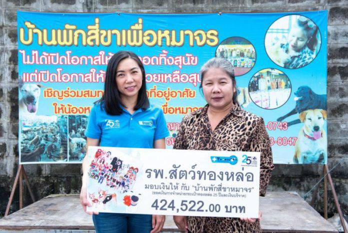 นางสาวเมสินี วิสิฐนรภัทร ผู้อำนวยการฝ่ายการตลาด โรงพยาบาลสัตว์ทองหล่อ พร้อมด้วยทีมพนักงานร่วมมอบเงินที่ได้จากการประมูลและจำหน่ายกระเป๋าผ้าสกรีนลวดลายพิเศษในโครงการช่วยเหลือสังคม “25th Anniversary Thonglor Pet Hospital” ซึ่งจัดขึ้นในวาระครบรอบ 25 ปีของโรงพยาบาลสัตว์ทองหล่อ จำนวน 424,522 บาท ให้กับ นางจุติภรณ์ ปรีชาสุชาติ หรือ “ป้าจุ๊ บ้านพักสี่ขาเพื่อหมาจร” จังหวัดปทุมธานี เพื่อนำไปช่วยเหลือสุนัขและแมวจรจัดที่เลี้ยงดูอยู่กว่า 1,500 ตัว ให้มีความเป็นอยู่ที่ดีขึ้น