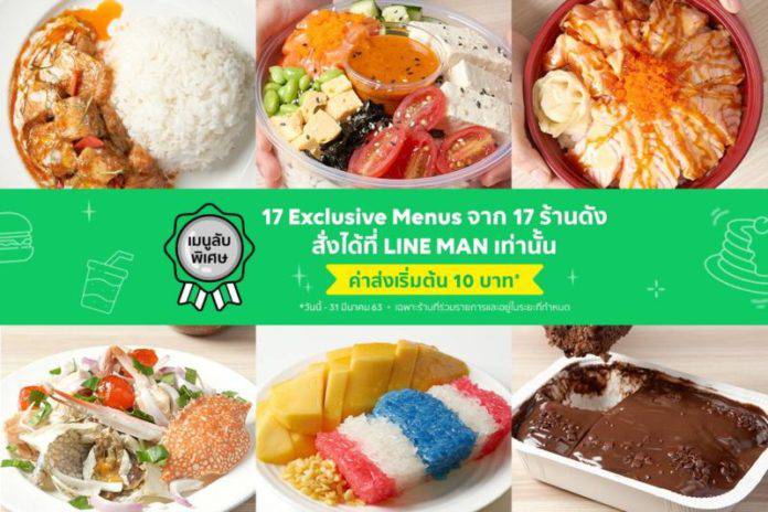 LINE MAN จับมือ 17 ร้านอาหารตั้งแต่เครือใหญ่ไปจนถึงสตรีท ฟู้ด ออกซีรีย์ “เอ็กซ์คลูซีฟ เมนู” เมนูพิเศษที่สั่งได้เฉพาะผู้ใช้แอปฯ LINE MAN สำหรับแคมเปญโปรโมชั่นพิเศษพร้อมค่าส่ง 10 บาท สำหรับเดือนมีนาคมนี้ ประกาศเดินหน้าสร้างประสบการณ์การกินที่พิเศษเพื่อผู้ใช้ ตอกย้ำการเป็นแพลตฟอร์มเดลิเวอรี่ที่พันธมิตรร้านอาหารในทุกระดับให้ความเชื่อมั่น