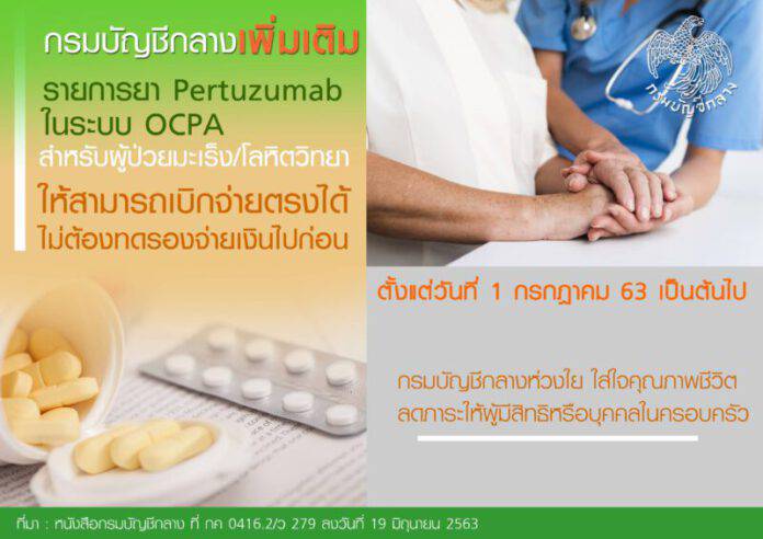 กรมบัญชีกลางห่วงใย ใส่ใจคุณภาพชีวิตผู้มีสิทธิและบุคคลในครอบครัวที่ป่วยด้วยโรคมะเร็งและโลหิตวิทยา ได้ปรับปรุงหลักเกณฑ์การเบิกจ่ายตรงค่ารักษาพยาบาล เพิ่มเติมรายการยา Pertuzumab ในระบบ OCPA ซึ่งใช้รักษามะเร็งเต้านม ให้สามารถเบิกจ่ายตรงได้ เพื่อลดภาระให้ผู้มีสิทธิและบุคคลในครอบครัวไม่ต้องทดรองจ่ายเงินไปก่อน ดีเดย์ 1 ก.ค. 63 เป็นต้นไป