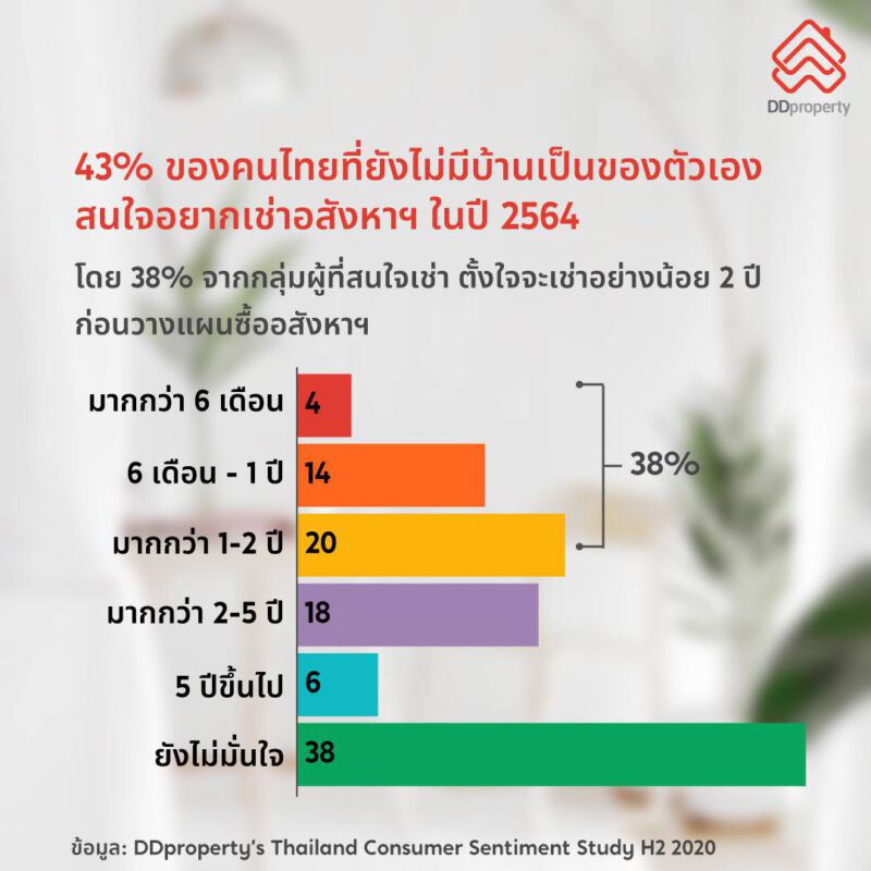 นอกจากนี้ ข้อมูลจากผลสำรวจฯ DDproperty’s Thailand Consumer Sentiment Study ฉบับล่าสุด ยังพบว่า 43% ของผู้บริโภคชาวไทยที่ยังไม่ได้ครอบครองอสังหาฯ วางแผนจะเช่าที่อยู่อาศัยในปีหน้า ในขณะที่ 38% ของผู้ตอบแบบสำรวจฯ ตั้งใจจะเช่าก่อน 2 ปี และวางแผนจะซื้อบ้านในภายหลัง