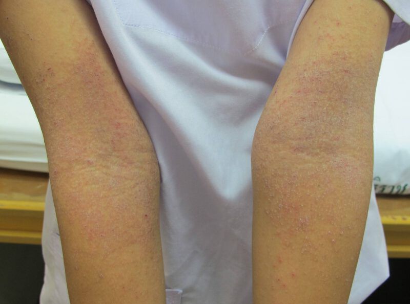 สำหรับลักษณะผื่นของโรคภูมิแพ้ผิวหนังในผู้ป่วย มี 3 แบบ ได้แก่ ระยะเฉียบพลัน คือ มีผื่นบวมแดงที่มีตุ่มน้ำขนาดเล็ก บางรายอาจมีน้ำเหลืองไหลซึมออกมา มีอาการคันมาก ระยะกึ่งเฉียบพลัน คือ ผื่นแดง ตุ่มน้ำ แห้งเป็นสะเก็ด มีขุยบ้าง มีอาการคันมาก ระยะเรื้อรัง คือ ผื่นจะมีสีไม่แดงมากหรือออกสีน้ำตาล อาจนูนหนา และเห็นร่องผิวหนังชัดเจน มีอาการคันมากผู้ป่วยภาวะเรื้อรังบางรายมีอาการคันรุนแรงจนส่งผลต่อการใช้ชีวิตและครอบครัว ตลอดจนกระทบความมั่นใจและการเข้าสังคม ผู้ป่วยบางรายอาจเลือกที่จะใส่เสื้อผ้าปกคลุมผิวหนังหลายๆ ส่วนของร่างกาย เนื่องจากความอาย จนนำไปสู่ผลกระทบต่อสภาพจิตใจ เกิดความเครียด กังวล และอาจนำไปสู่ภาวะซึมเศร้าได้ในที่สุด