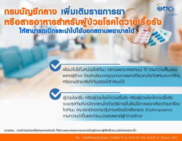 นอกจากการเพิ่มเติมรายการยาหรือสารอาหารที่จำเป็นข้างต้นแล้ว ยังกำหนดให้ผู้ป่วยโรคอื่น หรือผู้ป่วยโรคไตวายเรื้อรัง หรือผู้ป่วยโรคไตวายเรื้อรังระยะสุดท้ายที่บำบัดทดแทนไตด้วยวิธีการอื่นซึ่งมิใช่การฟอกเลือดด้วยเครื่องไตเทียม ให้สามารถเบิกยากระตุ้นการสร้างเม็ดเลือดแดง (Erythropoietin) เพื่อนำไปใช้นอกสถานพยาบาลของทางราชการได้ ตามความจำเป็นและคำแนะนำของแพทย์ผู้ทำการรักษา