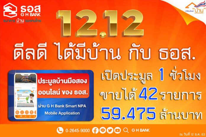ทั้งนี้ ในปี 2564 ธนาคารจะยังจัดมหกรรมประมูลบ้านออนไลน์กับ ธอส. ผ่าน Application : G H Bank Smart NPA เช่นเดิม โดยผู้ที่สนใจเข้าร่วมประมูลสามารถดาวน์โหลด Application : G H Bank Smart NPA และลงทะเบียนเข้าร่วมประมูลออนไลน์เพื่อรอเข้าร่วมประมูลออนไลน์กับ ธอส. ในครั้งต่อไปได้ทันที หรือติดตามข้อมูลข่าวสารของธนาคารเพิ่มเติมได้ที่ www.ghbhomecenter.com และ www.ghbank.co.th หรือติดต่อสอบถามรายละเอียดเพิ่มเติมที่ฝ่ายบริหาร NPA โทร. 0-2202-1582-3 และ 0-2202-1016 และฝ่ายบริหารหนี้ภูมิภาค โทร.0-2202-1170 และ 0-2202-2036