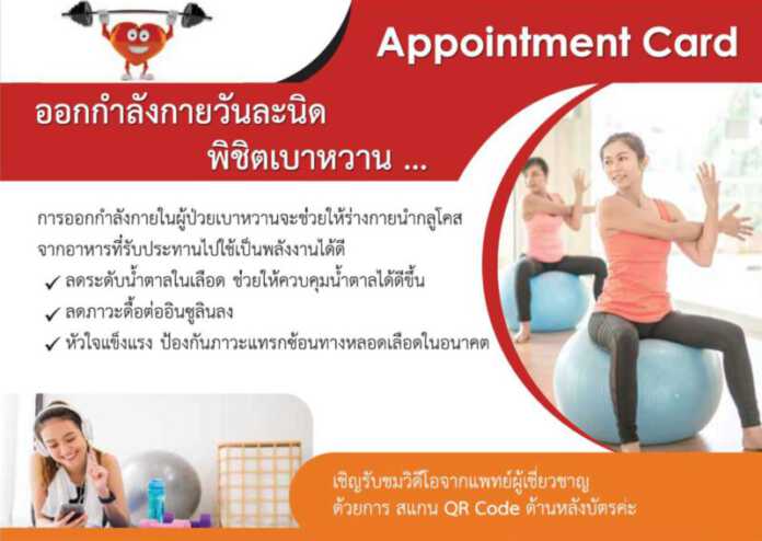 เพื่อควบคุมอาการและใช้ชีวิตได้อย่างปกติสุขมากยิ่งขึ้น ผู้ป่วยจึงจำเป็นต้องได้รับการดูแลและติดตามอาการอย่างใกล้ชิดจากแพทย์ผู้เชี่ยวชาญ พร้อมหมั่นตรวจเช็คร่างกายเป็นประจำตามที่นัดหมาย ซึ่งในการนัดหมายแต่ละครั้ง แพทย์ ณ โรงพยาบาลต่าง ๆ ควรจะ มีการมอบสมุดการจดบันทึกและติดตามระดับน้ำตาลในเลือด พร้อมยื่นใบนัดหมายแก่ผู้ป่วยสำหรับการพบแพทย์ในครั้งต่อไป อย่างไรก็ตาม มีผู้ป่วยจำนวนไม่น้อยที่ละเลย หรือหลงลืมมารับการตรวจตามนัดหมาย ดังนั้น เพื่อสร้างความน่าสนใจและเป็นการให้ความรู้แก่ผู้ป่วยโรคเบาหวานไปพร้อม ๆ กัน ปัจจุบันโรงพยาบาลชั้นนำต่าง ๆ ทั่วประเทศ ได้มอบบัตรนัดหมายรูปแบบใหม่ ที่นอกจากจะดูโดดเด่นสวยงามแล้วยังแทรกเกร็ดความรู้ง่าย ๆ ในการดูแลตัวเองให้แก่ผู้ป่วยอีกด้วย