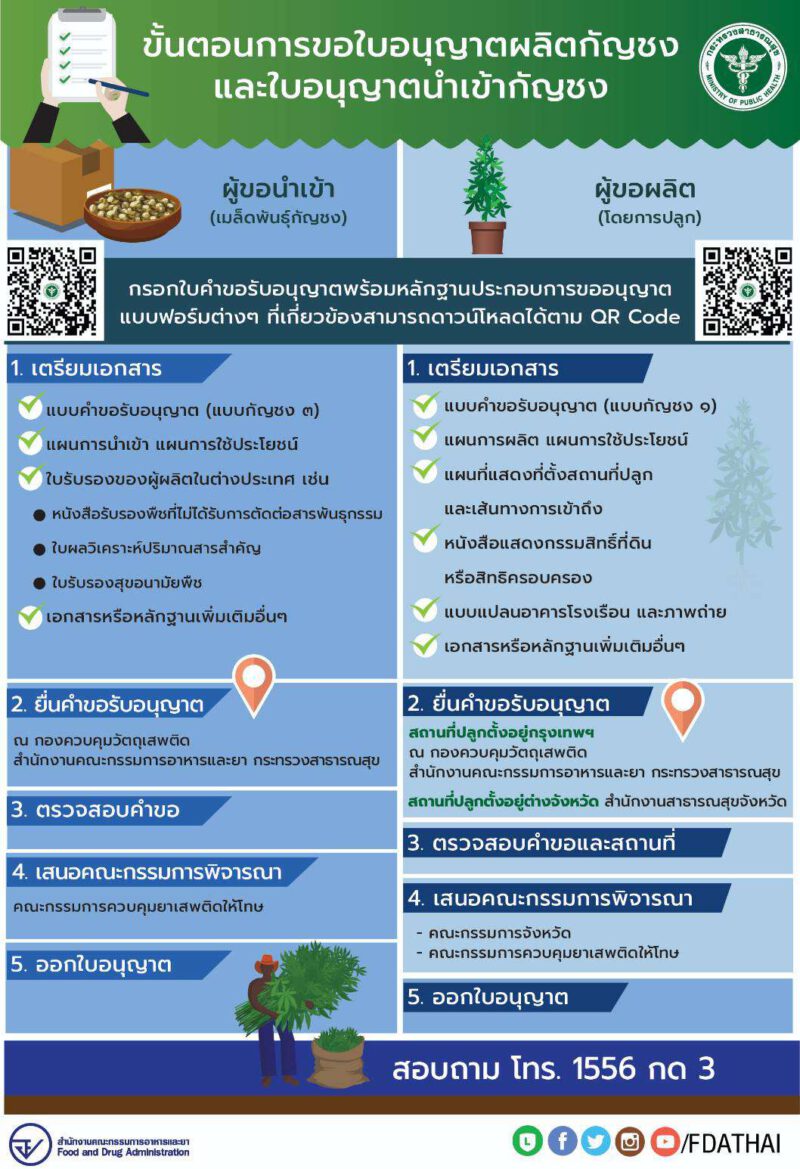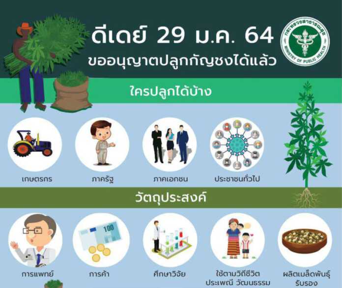 ดีเดย์! 29 ม.ค. 64 ทุกภาคส่วน ทั้งเกษตรกร ภาครัฐ ภาคเอกชน และประชาชนทั่วไปขออนุญาตปลูกกัญชงได้ทุกวัตถุประสงค์ ตั้งแต่ การค้า การแพทย์ การศึกษาวิจัย การใช้ตามวิถีชีวิต ประเพณี วัฒนธรรม หรือผลิตเมล็ดพันธุ์รับรอง และนำส่วนต่าง ๆ ของกัญชงไปแปรรูปเพื่อสร้างมูลค่าเพิ่ม ผู้ที่ต้องการขออนุญาตปลูก หากสถานที่ปลูกอยู่ที่กรุงเทพฯ ให้ยื่นคำขอที่ อย. หากอยู่ที่ต่างจังหวัด ให้ยื่นคำขอที่ สสจ. ส่วนการนำเข้าเมล็ดพันธุ์กัญชง ให้ยื่นคำขอที่ อย.