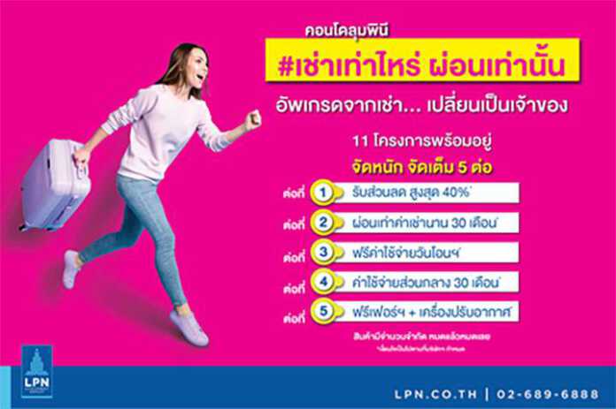 บริษัท แอล.พี.เอ็น.ดีเวลลอปเมนท์ จำกัด(มหาชน)(LPN) ส่งเสริมคนไทยมีบ้านเป็นของตัวเอง เปลี่ยนจากค่าเช่าบ้านเป็นค่าผ่อนบ้านแทน สร้างโอกาสให้คนไทยมีบ้านได้ง่ายขึ้นในราคาที่จับต้องได้ (Affordable Price) ด้วยแคมเปญใหม่ “#เช่าเท่าไหร่ ผ่อนเท่านั้น” โดย LPN จะช่วยลูกค้าผ่อนค่างวดกับสถาบันการเงินเป็นเวลา 30 เดือน เริ่มตั้งแต่ 3,200-13,000 บาท ขึ้นอยู่กับทำเลที่ตั้งของคอนโดมิเนียมทั้ง 11 โครงการ ที่เข้าร่วมแคมเปญ