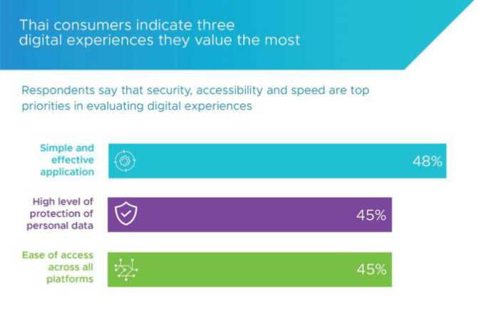 ในโลกดิจิทัลยุคใหม่ที่ภาคธุรกิจของไทยกำลังเผชิญกับการแข่งขันอย่างดุเดือด ผู้บริโภค 81% ระบุว่าตนเองได้เริ่มมีส่วนร่วมกับแบรนด์ที่นำเสนอประสบการณ์ดิจิทัลที่เหนือกว่า โดยแรงจูงใจที่สำคัญได้แก่ การสร้างสรรค์นวัตกรรมอย่างต่อเนื่อง การนำเสนอดิจิทัลคอนเทนต์ที่น่าสนใจ และความสะดวกในการใช้งาน เพื่อที่จะใช้ประโยชน์จากโอกาสดังกล่าว องค์กรต่างๆ จำเป็นที่จะต้องพัฒนาปรับปรุงเรื่องความปลอดภัย ความสะดวกในการใช้งาน และความรวดเร็วของบริการดิจิทัลที่นำเสนอ ดังจะเห็นได้ว่า ประสบการณ์ดิจิทัล 3 อย่างที่ผู้บริโภคชาวไทยให้ความสำคัญมากที่สุดได้แก่ แอปพลิเคชันที่ใช้งานง่ายและมีประสิทธิภาพ (48%), การปกป้องข้อมูลส่วนบุคคล (45%) และความสะดวกในการใช้งานบนอุปกรณ์ทุกรูปแบบ (45%)