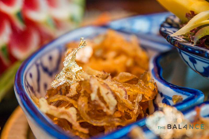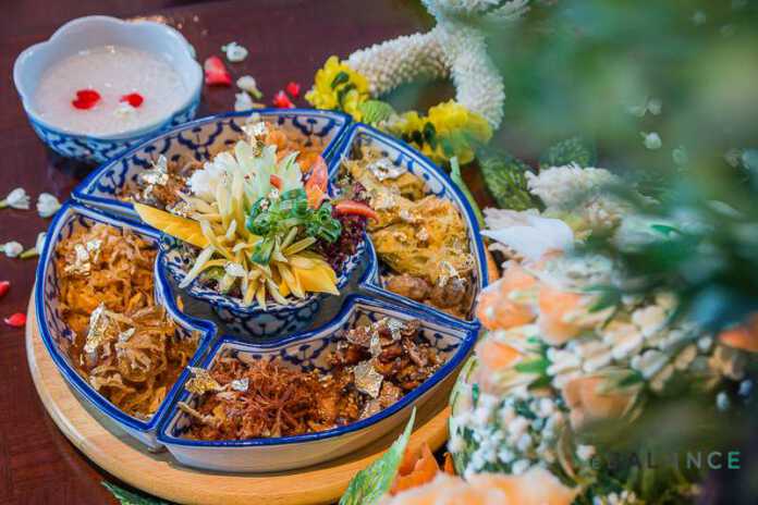 สัมผัสความสดชื่นไปด้วยการเริ่มต้นลิ้มรสความหอมสดชื่นจากน้ำลอยดอกมะลิอบควันเทียนที่เชฟบังอรนำข้าวหอมมะลิมาหุงและบรรจงขัดข้าวให้ขึ้นเงาจากนั้นจึงนำมานึ่งอีกครั้งก่อนนำมาแช่กับน้ำอบควันเทียน เชฟบังอรได้ใช้เวลาบรรจงรังสรรค์เครื่องเคียงและผักแนมแกะสลักอย่างละเมียดละไม กะปิชุบไข่ทอดไฮไลท์หลักของข้าวแช่ที่ใช้เวลาผัดให้เข้ากันนานถึง 8 ชั่วโมง เพื่อให้กะปิและเครื่องผัดรวมกันเป็นเนื้อเดียว, ปลาช่อนแห้งผัดหวาน, หัวไชโป๊วผัดหวาน, หัวไชโป๊วผัดไข่, หมูฝอย, เนื้อฝอย, หอมยัดไส้ปลาชุบแป้งทอด, พริกหยวกสอดไส้หมูผสมกุ้ง และไข่แดงเค็มชุบไข่ขาวทอดได้ความหอมมันของไข่แดง