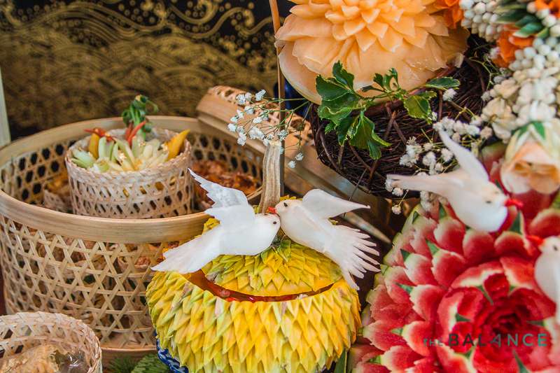 เพื่อประสบการณ์การรับประทาน “ข้าวแช่สุวรรณภูมิ” ที่ดีที่สุดควรเริ่มจากการทานของคาวที่สุดก่อนอย่างลูกกะปิ เคี้ยวให้ได้ลิ้มรสชาติ แล้วจึงตักข้าวแช่ขึ้นทานตามพร้อมน้ำลอยดอกไม้สักเล็กน้อย รสชาติความเข้มข้นของเครื่องเคียงจะผสมผสานกับความเย็นของข้าวแช่ จากนั้นจึงตามด้วยเครื่องเคียงหวานอย่างปลาช่อนแห้งผัดหวาน และเครื่องคาวอื่นๆ สลับสับเปลี่ยนได้ตามชอบ โดยทานคู่กับผักแนมที่เชฟบังอรได้แกะสลักผักสดไว้สำหรับทานแกล้มอย่างประณีตงดงาม ไม่ว่าจะเป็น มะม่วงแก้วขมิ้น กระชาย ต้นหอม และแตงกวา
