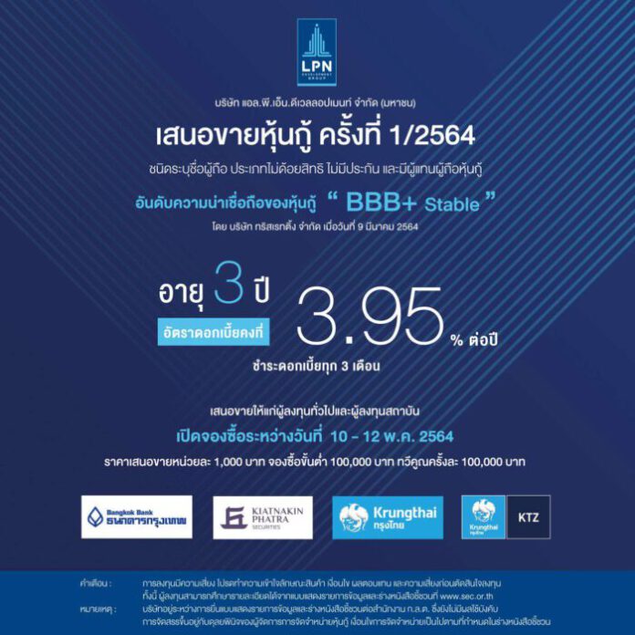 อภิชาติ เกษมกุลศิริ เจ้าหน้าที่บริหารระดับสูงด้านการเงิน บริษัท แอล.พี.เอ็น.ดีเวลลอปเมนท์ จำกัด (มหาชน) (LPN) เปิดเผยว่า LPN เตรียมเสนอขายหุ้นกู้ไม่ด้อยสิทธิ ไม่มีประกัน และมีผู้แทนผู้ถือหุ้นกู้ให้กับผู้ลงทุนทั่วไป อายุหุ้นกู้ 3 ปี อัตราดอกเบี้ยคงที่ 3.95% ต่อปี กำหนดจ่ายดอกเบี้ยทุก 3 เดือน มูลค่าจองซื้อขั้นต่ำ 100,000 บาท และทวีคูณทุก 100,000 บาท กำหนดเสนอขายวันที่ 10 – 12 พฤษภาคม 2564 โดยมีวัตถุประสงค์ในการนำเงินได้จากการออกหุ้นกู้ครั้งนี้ไปซื้อที่ดิน เพื่อใช้ในการขยายกิจการและรองรับเป้ารายได้และการเติบโตในอนาคตตามแผนธุรกิจปี 2564-2567