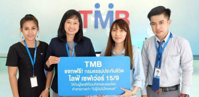 นางสาวธนาวรรณ โกมุท (ที่ 2 จากซ้าย) ผู้จัดการธุรกิจสาขา ทีเอ็มบี หรือ ธนาคารทหารไทย จำกัด (มหาชน) มอบกรมธรรม์ประกันชีวิตไลฟ์ เซฟเว่อร์ 15/9 มูลค่า 108,000 บาท แก่ นางสาวนัดดา รัตนาภรณ์ (ที่ 3 จากซ้าย) 1 ใน 5 ของลูกค้าเจ้าของข้อความโดนๆ ในแคมเปญ “เงินหายไปไหนหมด” ซึ่งลูกค้าทั้ง 5 คน จะได้รับผลประโยชน์ตามกรมธรรม์ประกันชีวิต ไลฟ์ เซฟเว่อร์ 15/9 ได้แก่ รับเงินคืนทุกปีๆ ละ 2,000 บาท ตั้งแต่สิ้นปีกรมธรรม์ที่ 1-15 พร้อมรับเงินก้อนโตอีก 100,000 บาท ณ สิ้นปีกรมธรรม์ที่ 15 หรือ ความคุ้มครองชีวิต 50,000 บาทกรณีเสียชีวิต โดยกิจกรรมครั้งนี้ ได้เชิญชวนลูกค้าสารภาพว่า “เงินหายไปไหนหมด” คำสารภาพไหนโดนใจ รับฟรี!! กรมธรรม์ไลฟ์ เซฟเว่อร์ 15/9 มูลค่า 108,000 บาท จำนวน 5 รางวัล คิดเป็นมูลค่ารวมกว่า 500,000 บาท ซึ่งมีผู้เข้ากิจกรรมจำนวนร่วม 4,000 คน ทั้งนี้ สามารถดูประกาศผลได้ทาง TMB Facebook หรือ www.tmbbank.com/lifesaver15-9/activity