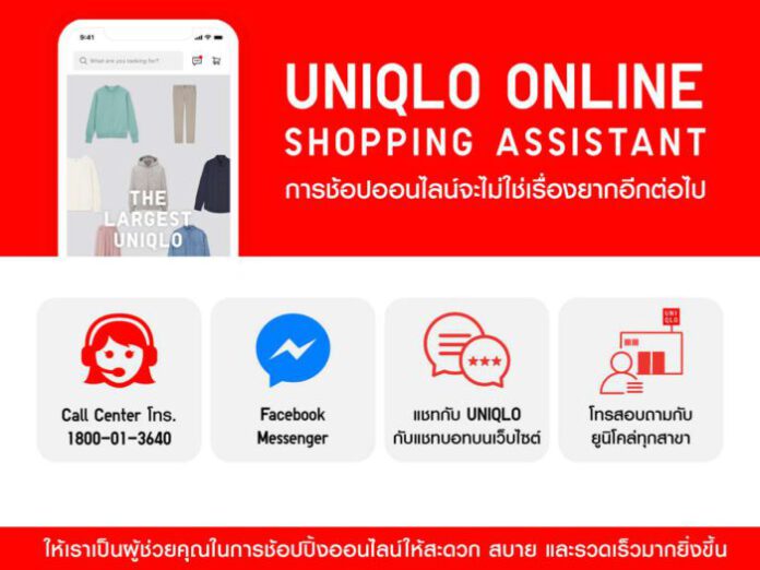 Uniqlo Online Shopping Assistant บริการผู้ช่วยคู่ใจที่จะช่วยเสริมประสบการณ์การช้อปออนไลน์ให้สะดวกสบายยิ่งขึ้น ไม่ว่าจะเป็น คอลเซ็นเตอร์ ที่สามารถติดต่อได้ทุกวันที่เบอร์ 1800-01-3640 ตั้งแต่เวลา 9:00 น. – 18:00 น. เฟซบุ๊ก เมสเซนเจอร์ ที่สามารถส่งข้อความหาเจ้าหน้าที่ได้ทันทีทางกล่องข้อความของเฟซบุ๊กยูนิโคล่ หรือจะแชทกับยูนิโคล่บนเว็บไซต์ ซึ่งมียูนิโคล่แชทบอทคอยตอบคำถามตลอด 24 ชั่วโมง หรือจะโทรสอบถามกับพนักงานยูนิโคล่โดยตรงก็สามารถโทรไปที่ร้านได้ทุกสาขา